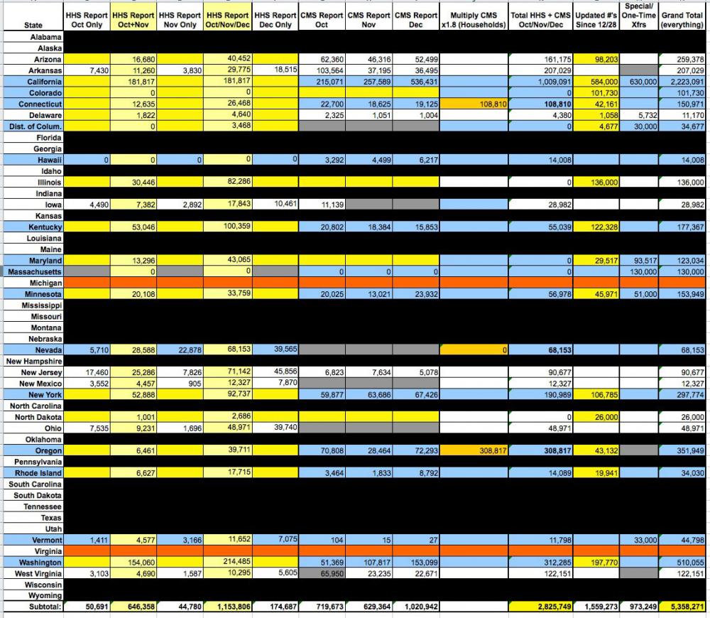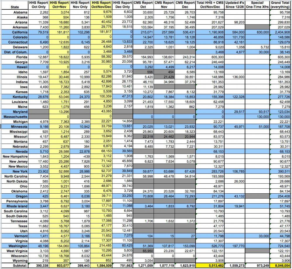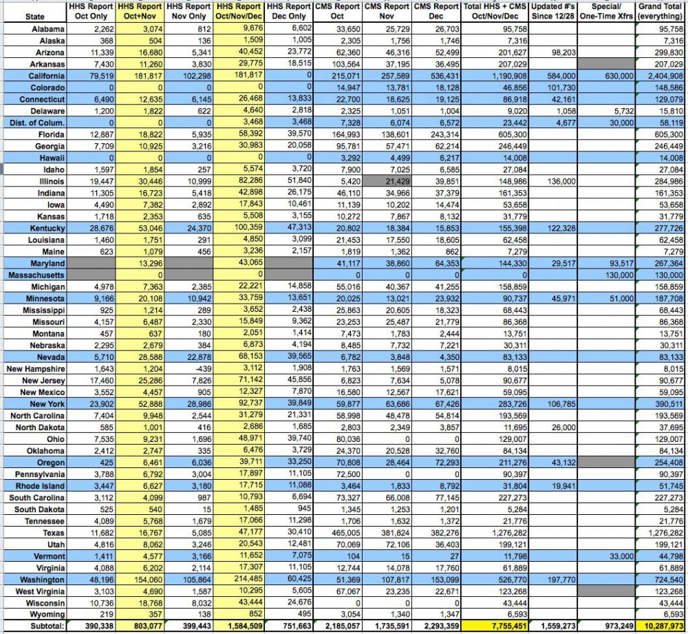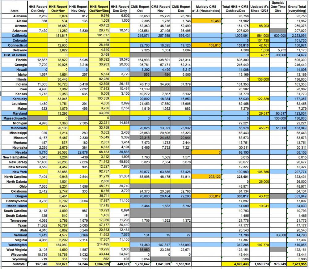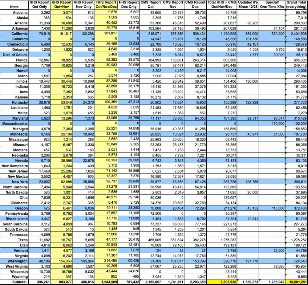 - Everything below except for the "updates since 12/28" and some (not all) of the Special/One-Time Transfers come directly from the official HHS and CMS reports. If their data (and especially their footnotes) are accurate and comprehensive, then everything else should be correct. If any key data from their reports is either missing or incorrect, then obviously the rest of my calculations would be off accordingly.