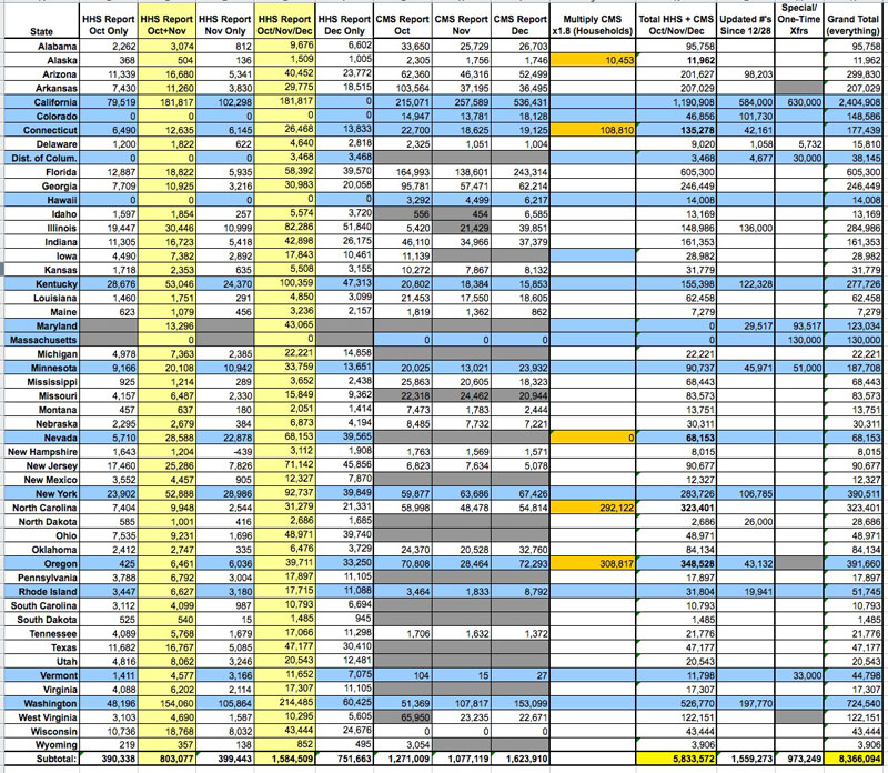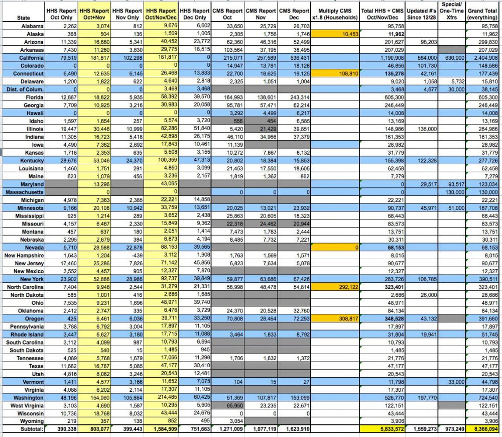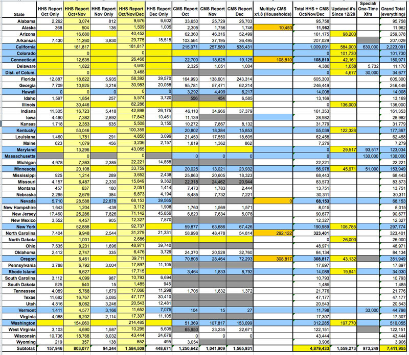 The first spreadsheet plugs in EVERYTHING. HHS totals for all 3 months, CMS totals for all 3 months, Special/One-TIme Transfers and Updates since 12/28. All of it.
