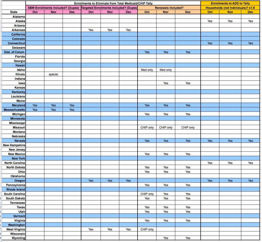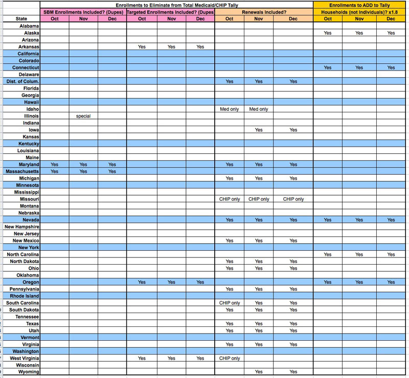 I've gone back through all 3 CMS reports and have painstakingly pulled out all of the footnotes which are relevant to the Medicaid/CHIP enrollments (ignoring all the others related to stuff like Title XIX programs, AIDS Drug Assistance programs, data missing from couny welfare agencies and so forth…that still leaves 63 notes!)