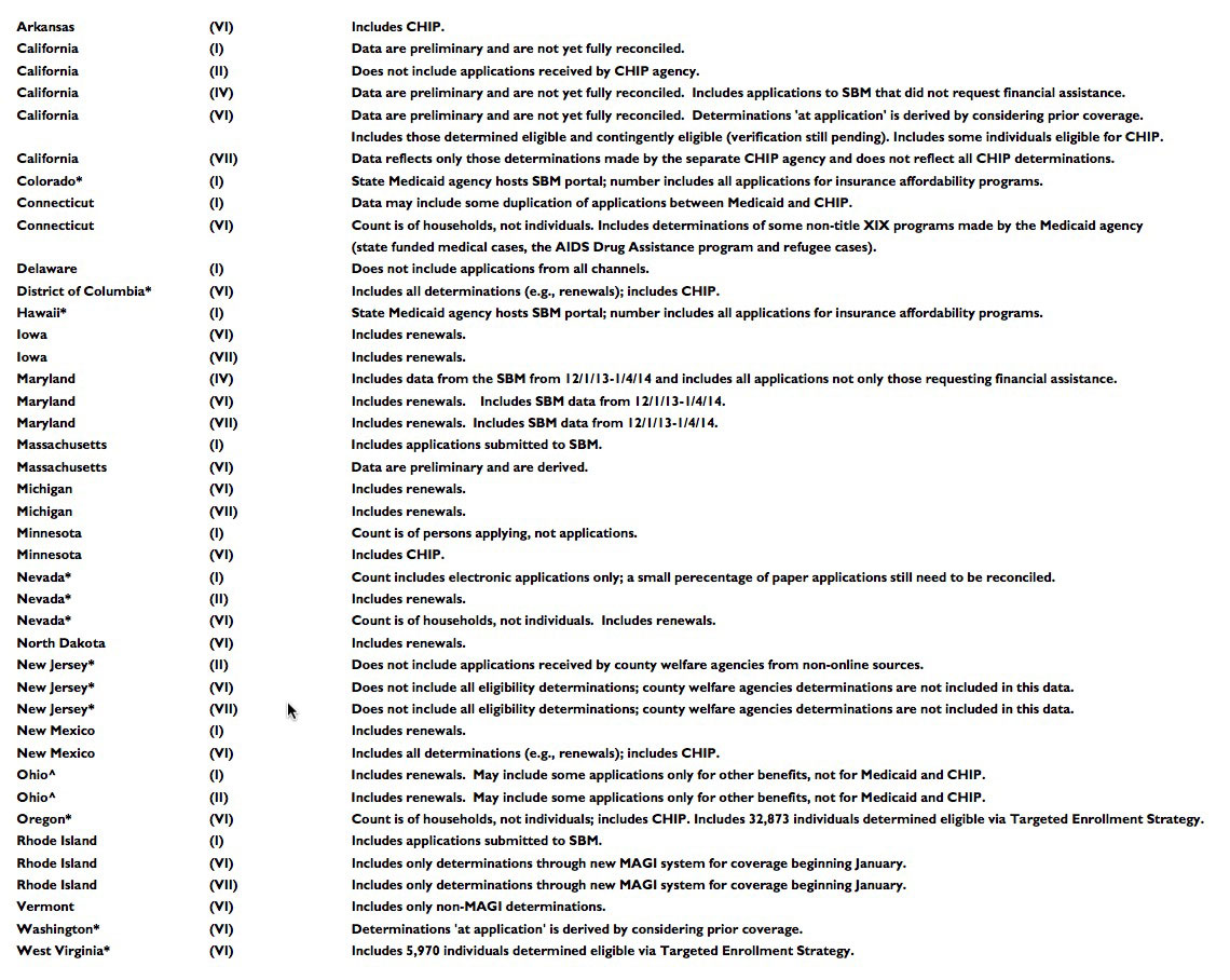 If you look at the footnotes on Page 6 of the December CMS Report, you can see that according to the official CMS report there are only two states in which the report includes SBM data for Medicaid and CHIP Determinations (columns VI and VII): Maryland and Massachusetts. There are no other states listed as inlcuding SBM data for those columns. A couple of other states (California, Rhode Island) do mention including applications from the SBM's, but not the actual determinations, which are what we're talking about here. The reports for October and November only include SBM determinations from MD and MA as well: