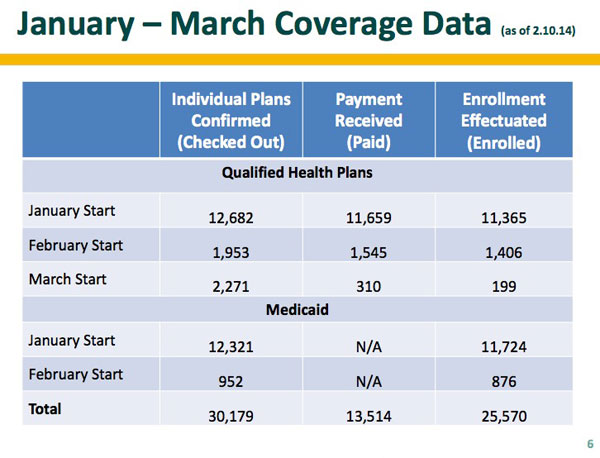 Page 6 has the key data: A total of 16,906 QHP enrollees as of 2/10, of whom 13,514 are paid up. Overall, this points to an 80% paid rate, which is very good--but the monthly breakout is even more interesting: January-start enrollees have a 92% paid rate (which you'd certainly hope for by now, considering that we're into mid-February) and February-start enrollees are at 79% paid. The March-start enrollees (14%) are the ones providing the main drag on the total...but this is hardly shocking since the start date for that coverage is still over 2 weeks away.