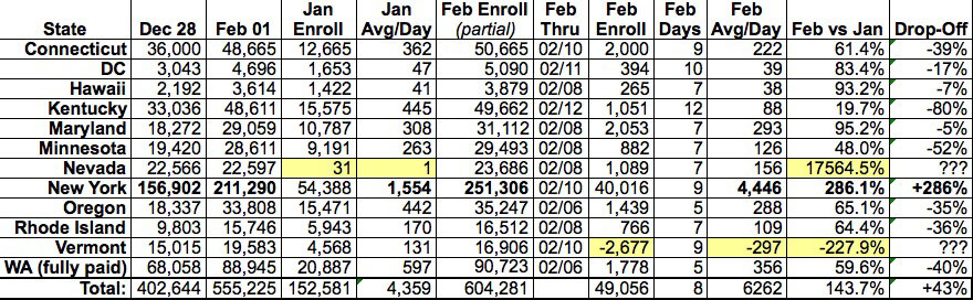 On the other hand, this data is still a bit spotty, as it only measures states representing 16% of the country, and only about 1/3 of the month at that. I'll keep an eye on the state-level data to see if any other states show better numbers; a small spike over January's enrollments from a state like California could negate the 10 states above in one shot.