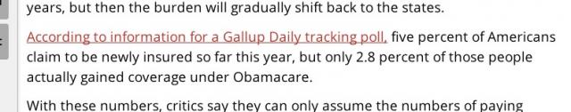 (sigh) No, Ms. Bleau, that's not what the Gallup tracking poll said either. You make it sound like Gallup is claiming that 2.8% of 5% "claim" to be newly insured, which would be only 0.14% of the population. What you meant to say is that 5% are newly insured, of which 56% (2.8 / 5.0) gained coverage via the ACA exchanges.