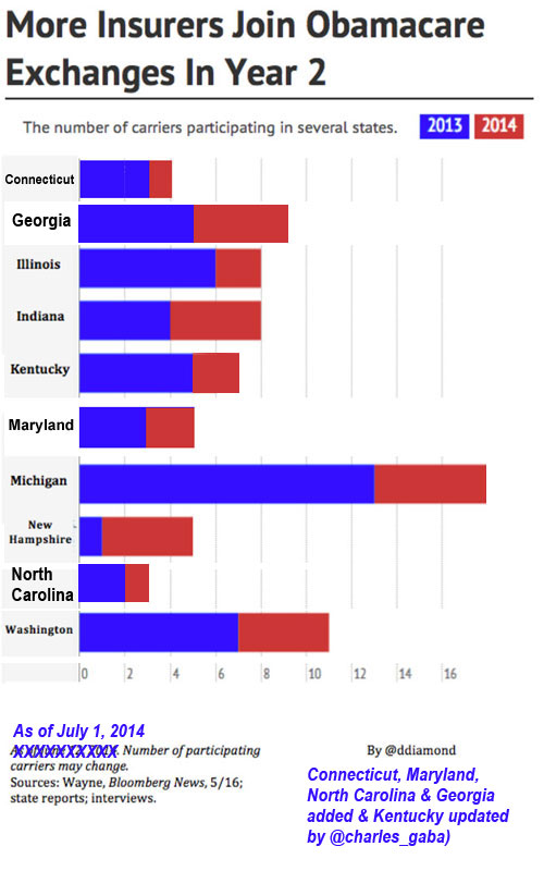 Also, you may recall a nice graph by Dan Diamond from a couple of weeks back showing the states which are increasing their exchange competition for 2015; I've crudely updated it with new competition data from 4 additional states: Connecticut, Maryland, North Carolina and Georgia (plus one more added to Kentucky since he posted it):