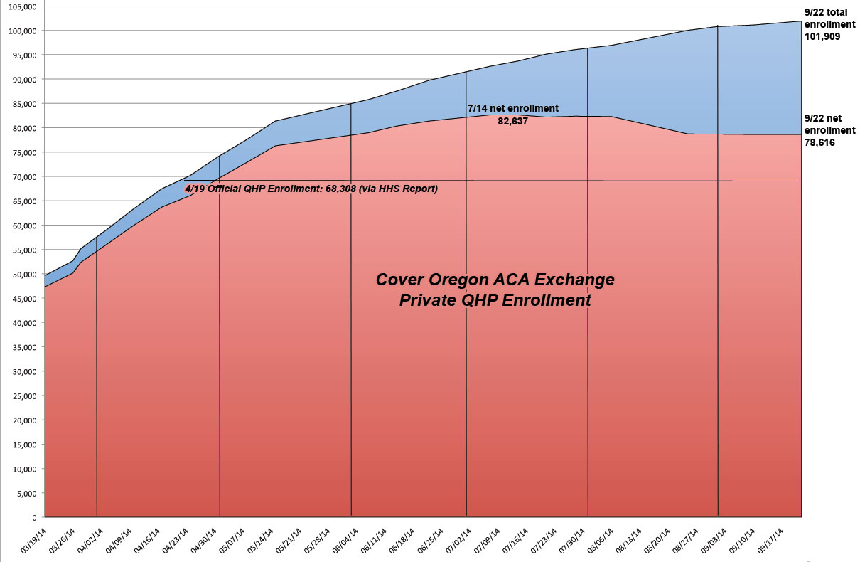 Total private medical insurance enrollments through Cover Oregon: 101,909Oregon Health Plan enrollments through Cover Oregon: 252,362*