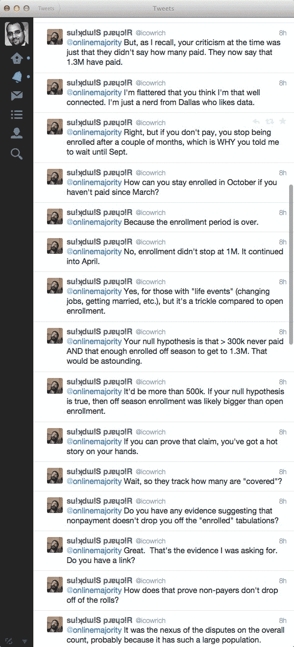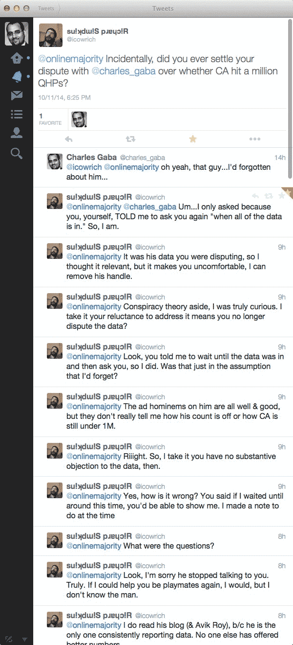 Last night, @icowrich (the other guy referred to in Michael's original tweet above, and a regular commenter here at ACA Signups), who didn't forget, decided to follow up with him regarding his "no way CA hit a million paid" claim from March.