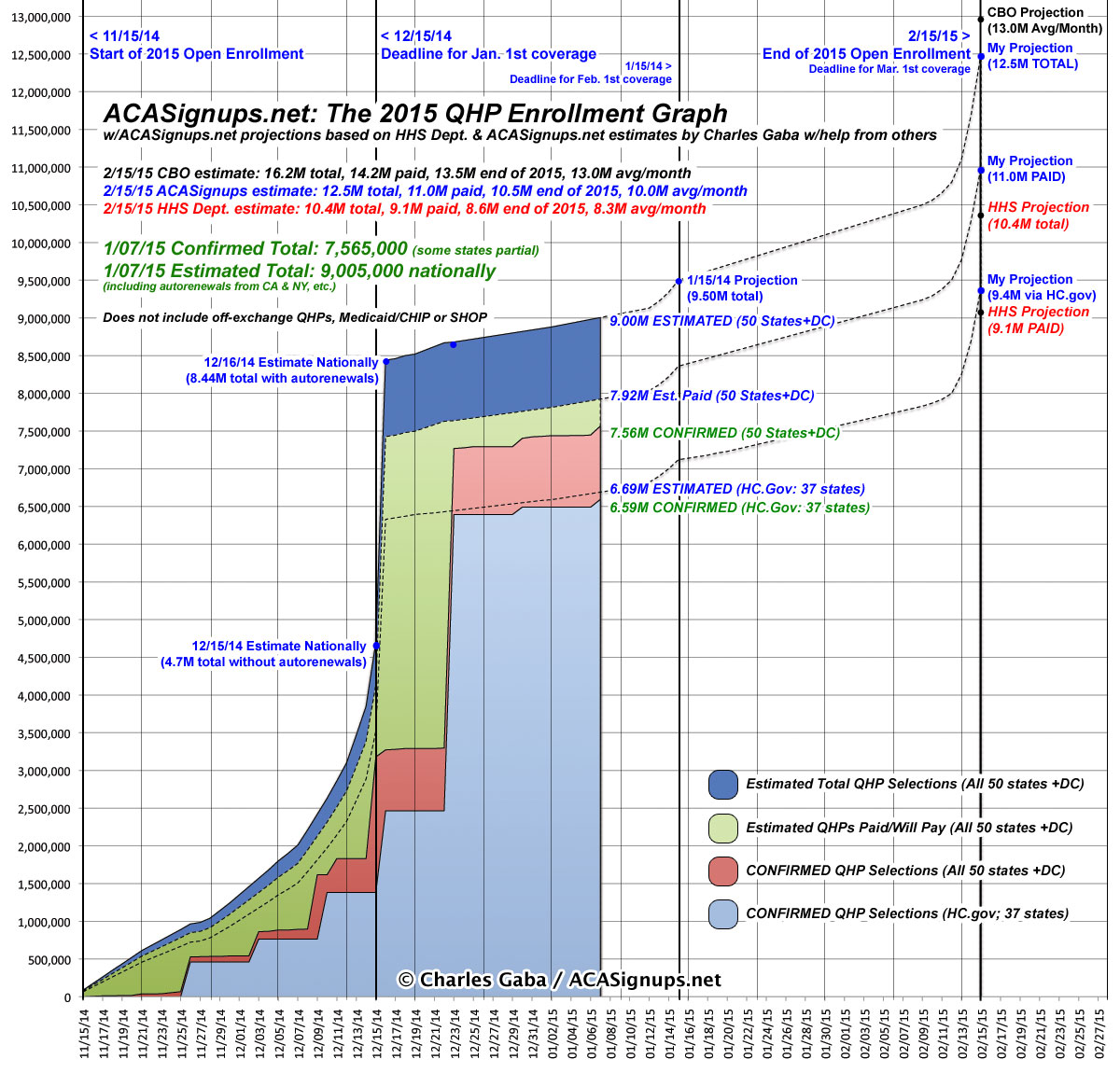 As always, this is just an estimate; it could be slightly higher or lower. However, my best estimate is that 2015 private QHP selections via the various ACA exchanges (HC.gov plus the 14 state-based versions) will cross the 9 million milestone sometime today if it hasn't already done so.