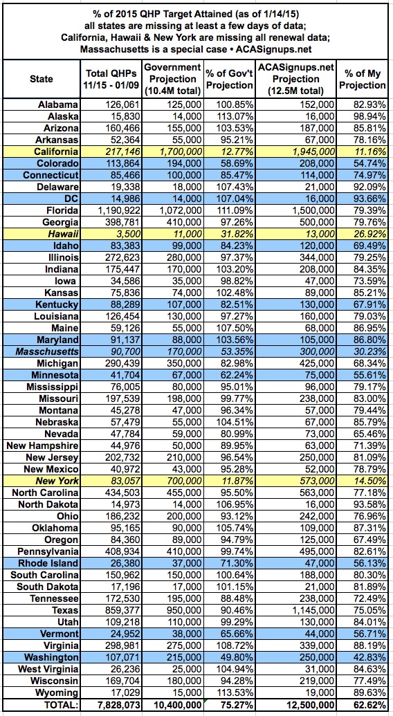 - Finally, aside from the 1.3 million estimated missing renewals, it's important to remember that there should be roughly 240,000 more QHPs scattered among all 50 states (+DC), which should mean that a few more states may have already nudged across the 100% mark already.
