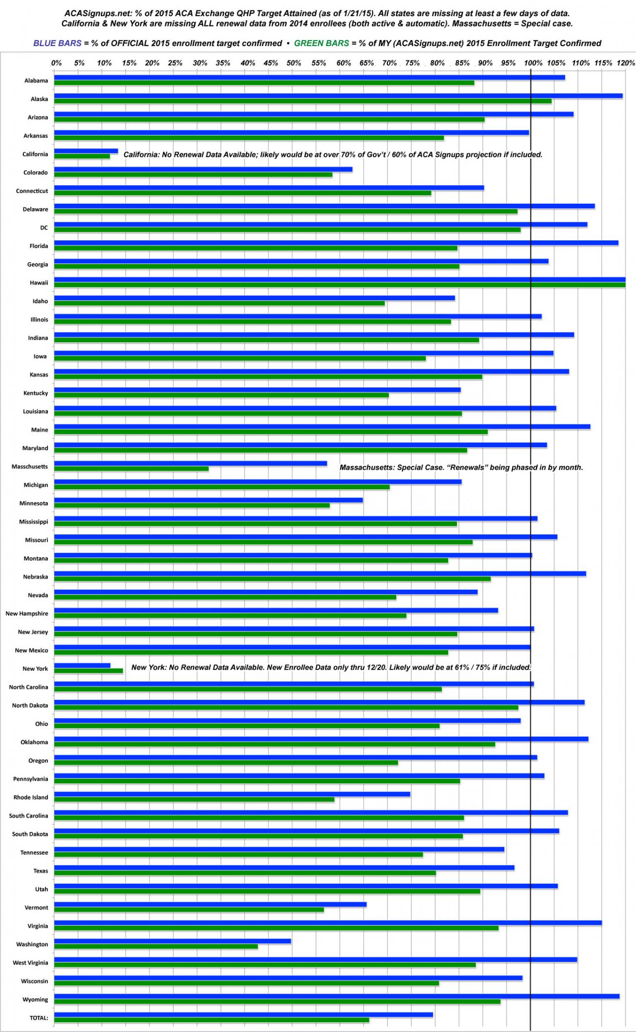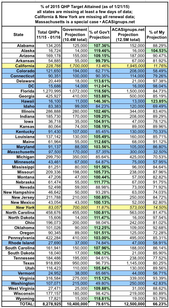 • Add 'em all up and there are now 8.28 million confirmed QHP selections for 2015 nationally. As of today, I'm pretty sure the actual number is closer to 9.7 million (1.3 million NY/CA renewals, plus another 120K or so scattered amongst all of the states).