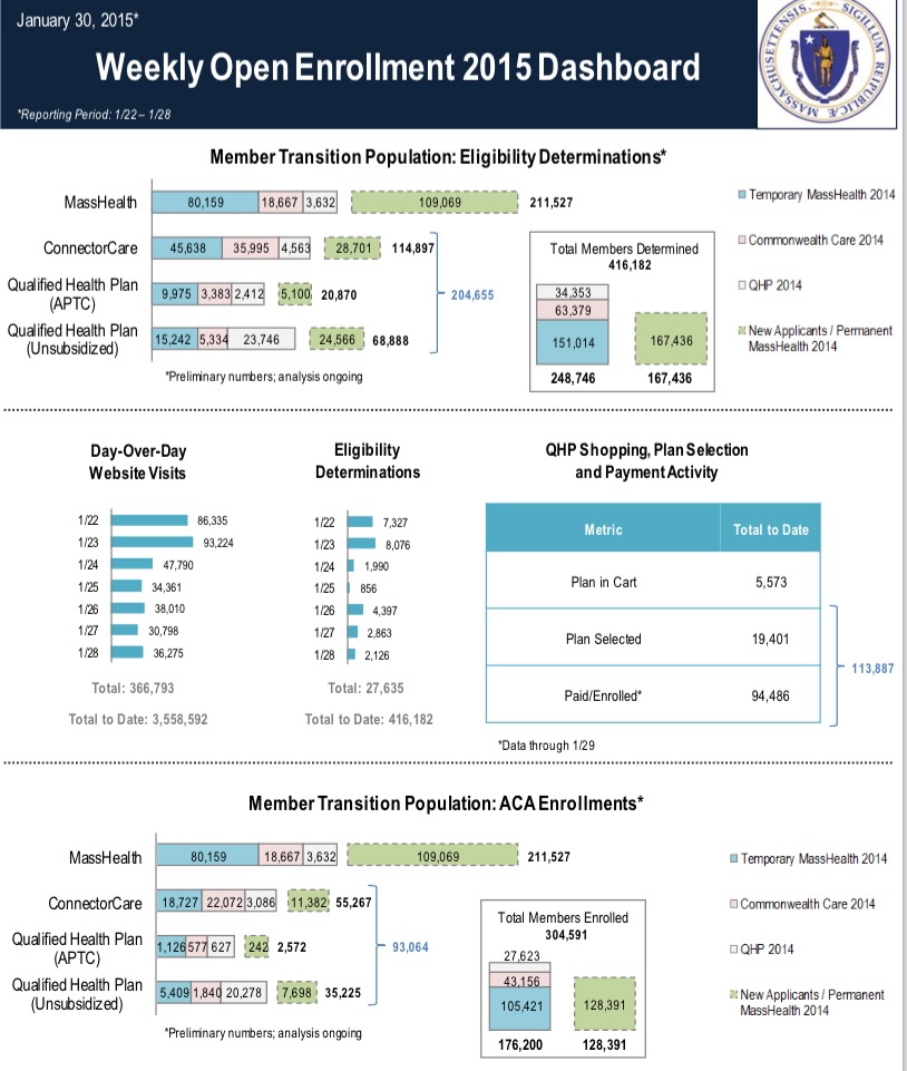 Massachusetts has now enrolled 3.6x as many people for 2015 via their exchange as they did last year, and there's still 17 days to go, including the final push. They averaged just 834 per day over the past week (understandable since most of it was after their monthly deadline). At that rate they would only add another 15,000 or so by 2/15, but I'm expecting  3-4x that number when the dust settles, or around 160 - 175K. This would be right in line with the exchange's own expectations (around 170K or so), which would be very impressive, but it would also mean that I was seriously misunderstanding how many people were stuck in MA's weird-ass "temporary healthcare purgatory" program.