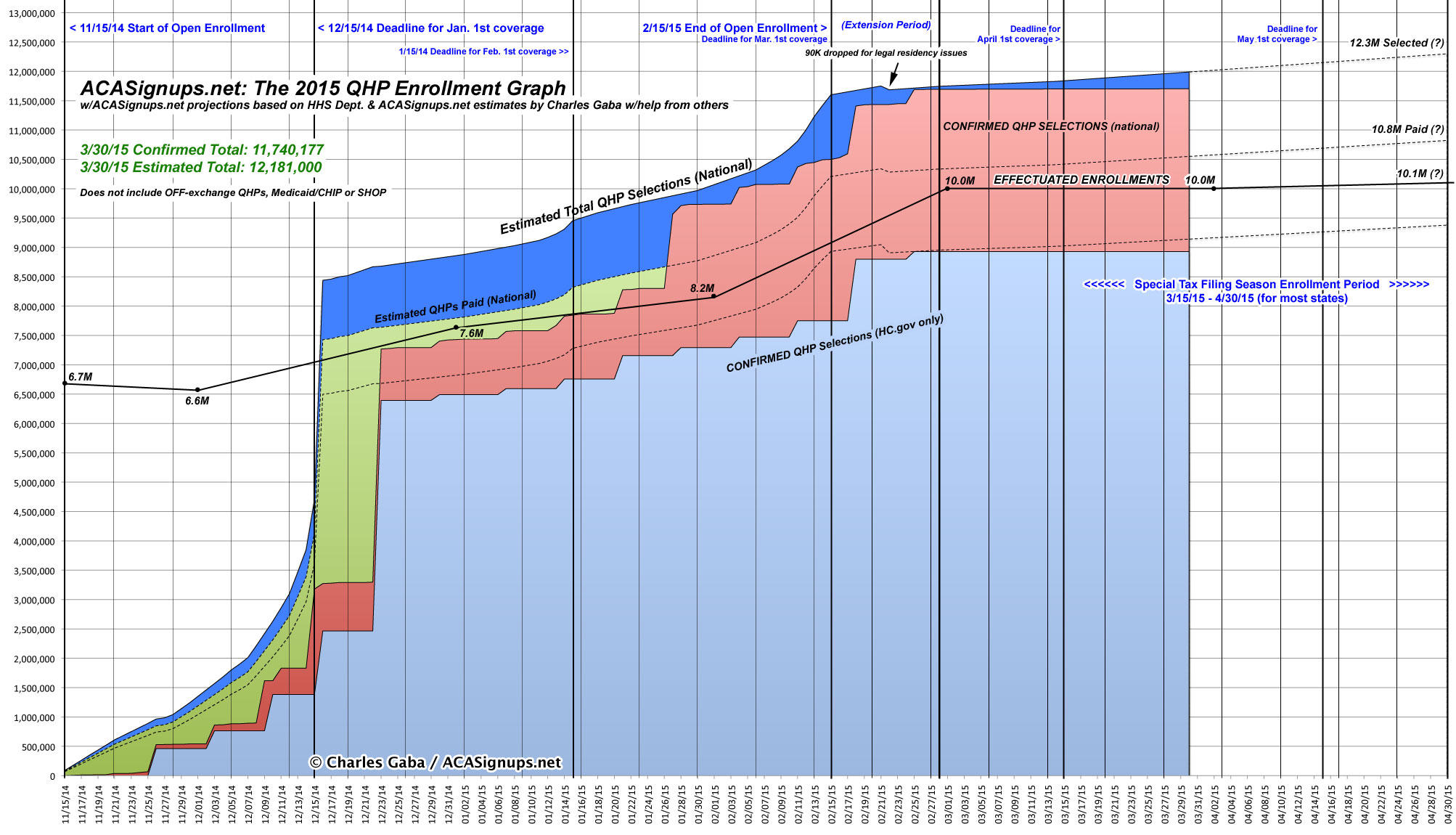 Until now, I was assuming that total QHP selections would hit around 12.9 million as of April 30th (11.3 million paid), with effectuated enrollments hitting perhaps 10.4 million on May 1st.