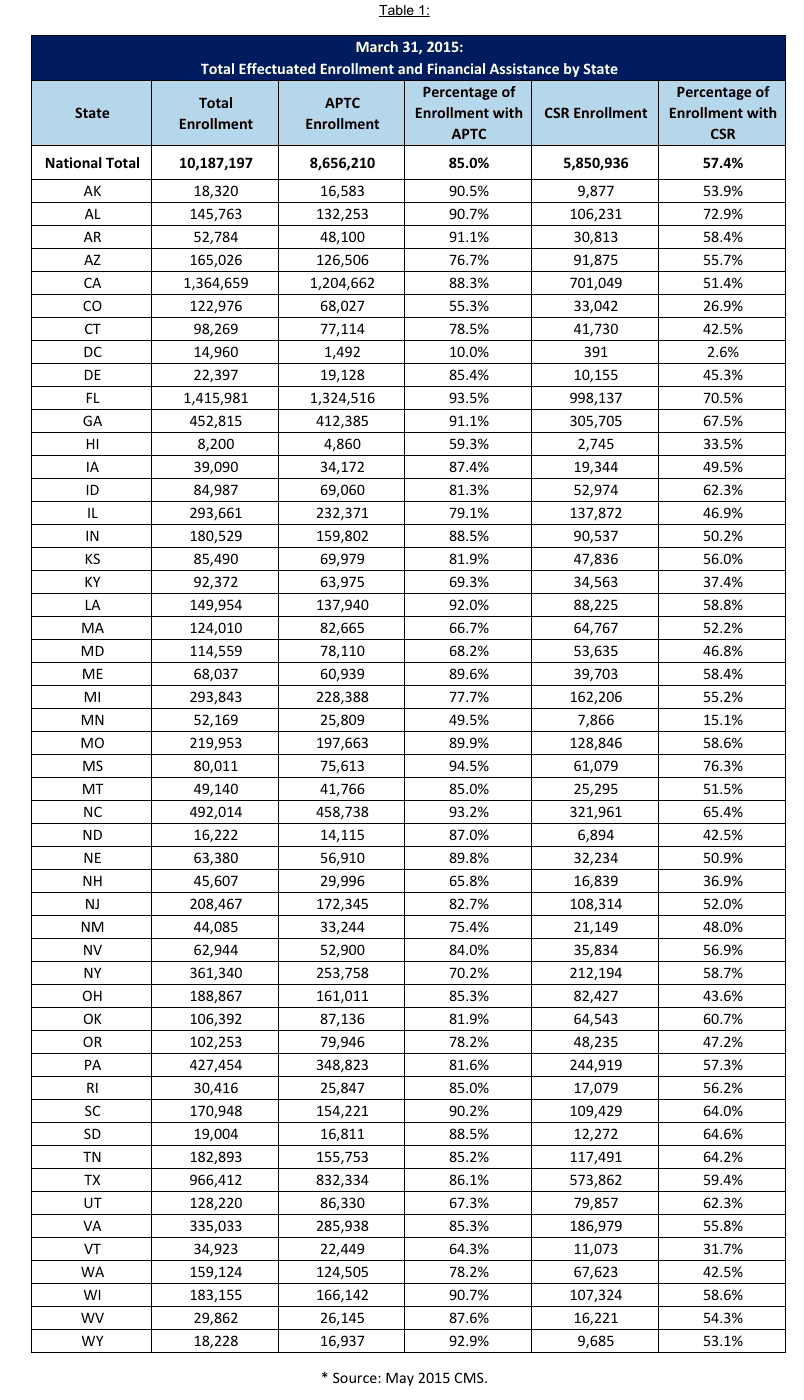 Table 1: March, 2015 Total Effectuated Enrollment and Financial Assistance by State
