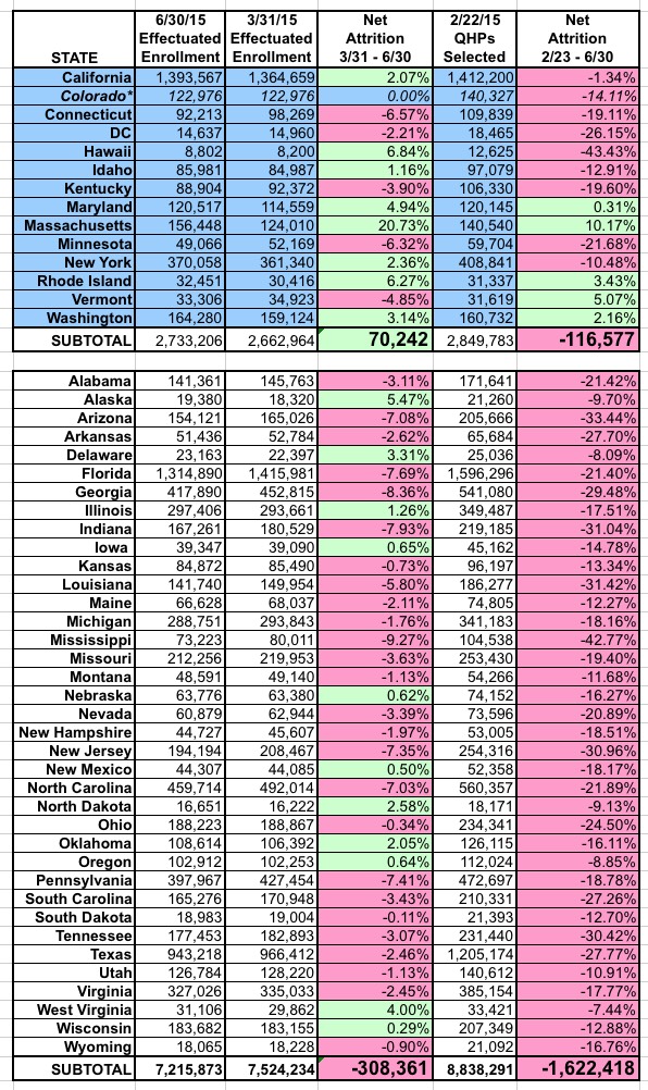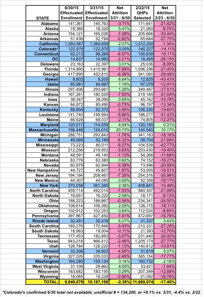 • Colorado's June number is listed as being identical to their March number because CMS was unable to verify their June enrollment and simply copied the March number over. Their unofficial June 30 figure is 134,200, or about 9.1% higher than it was on 3/31.