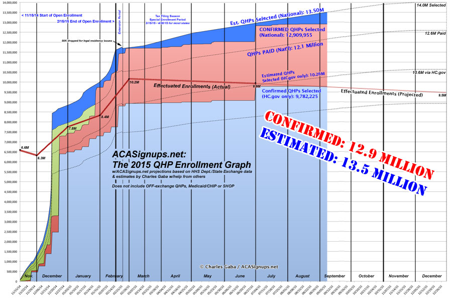 For months now, I've been operating on the assumption that the total number of currently effectuated private ACA exchange policies has been roughly 10.3 - 10.4 million, give or take. This was based on a combination of last year's enrollment pattern, the 214,000 additional people who selected QHPs during the #ACATaxTime special enrollment period, as well as assorted state-level enrollment updates out of California, Maryland and a few other state-based marketplaces.