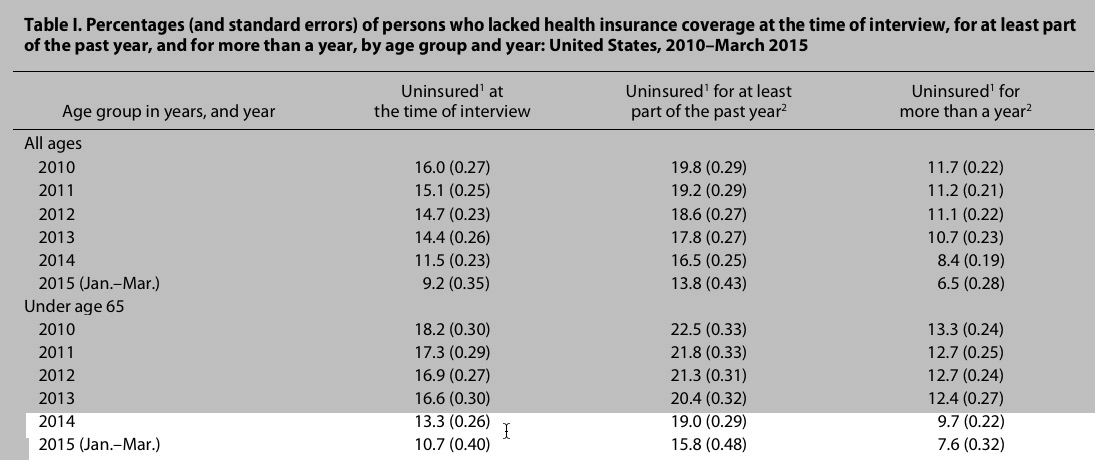 Now, it's important to note that the CBO report was referring to those under 65, but even so, take a look at the first column of this CDC's NHIS survey from earlier this year: