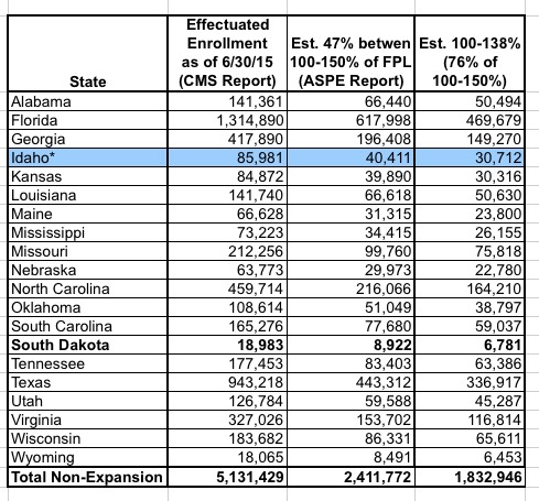 Of course, only around 23% of those on the individual market in South Dakota are enrolled through DAKOTACARE, and I don't know what proportion of those 6,800 in the 100-138% range are among them, but assuming an even spread among the insurance carriers, expanding Medicaid should provide an easy solution to around 1,600 of them.