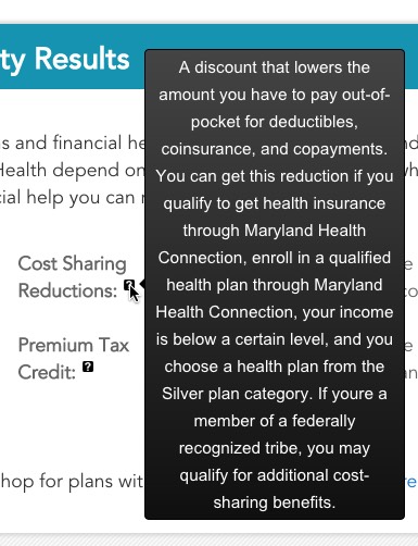 I've poked around the MD exchange, and have some praise as well as one complaint about how the site is set up (note that I'm not sure how many of these features are changed from last year). Most of the praise has to do with cost sharing reductions, which are only available for silver plans (for those under 250% of the Federal Poverty Line). Most people know about the APTC (Advance Premium Tax Credits) which lower the monthly premiums for those under 400% FPL, but very few know anything about CSR assistance, which cuts deductibles, co-pays and co-insurance down to size for those under 250% FPL.