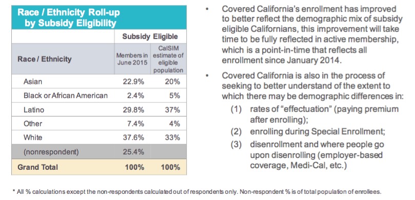 Covered California also released data on the ethnicity of its enrollment population, which illustrates the positive enrollment trends seen over the last 18 months. While Covered California is increasingly improving its enrollment to better reflect the diversity of subsidy-eligible Californians, this improvement will take time to be fully reflected in active membership, which accounts for all the consumers enrolled since January 2014.