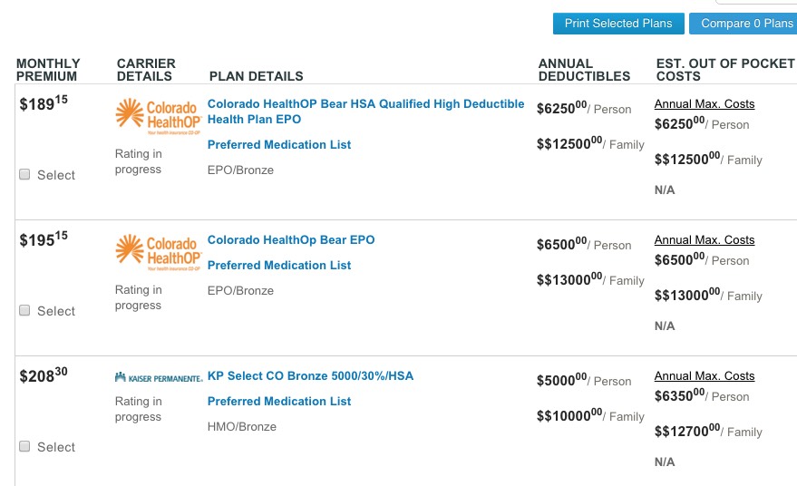 The big bummer here, of course, is that Colorado HealthOP, the ACA-created CO-OP which was wiped out by the Risk Corridor Massacre, is no longer available for 2016 (although oddly, it's still listed as being a choice for off-season 2015 enrollment for December only):