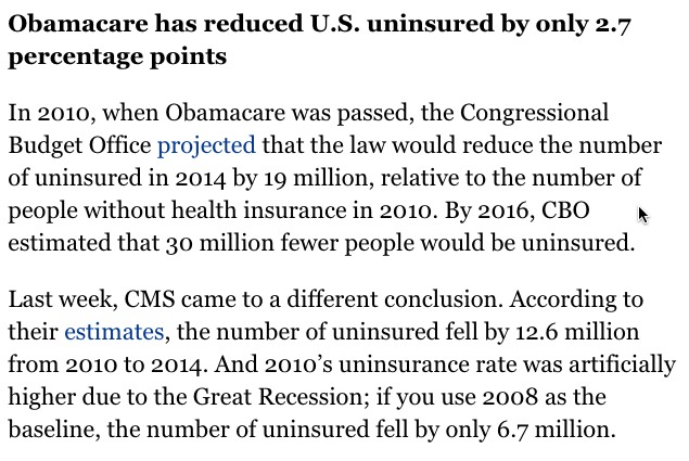And because growth in enrollment in Obamacare’s exchanges has flatlined, while premiums continue to go up, there’s little reason to believe that the ultimate reduction in the uninsured will ever reach 30 million under the law.
