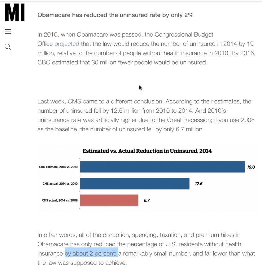 In other words, all of the disruption, spending, taxation, and premium hikes in Obamacare has only reduced the percentage of U.S. residents without health insurance by about 2 percent: a remarkably small number, and far lower than what the law was supposed to achieve.