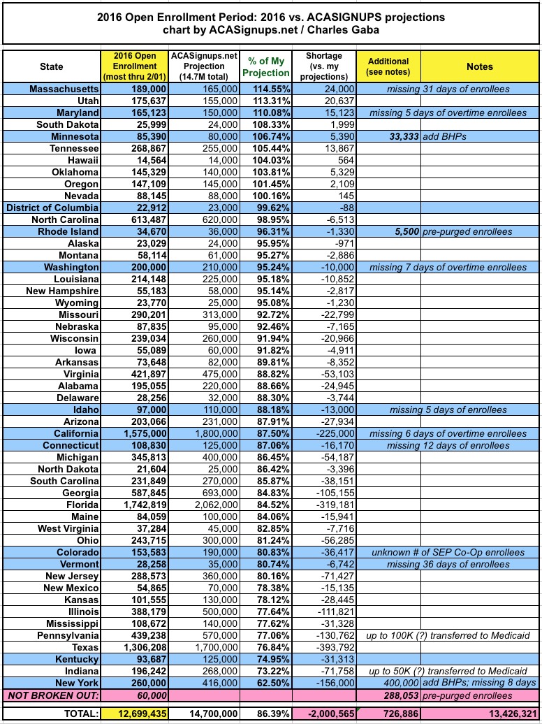 I noted over a week ago that, after seeing the writing on the wall for several weeks and lowering my final 2016 Open Enrollment Period projection from 14.7 million to around 13.8 million, the time had come to lower it once again, to somewhere between 12.4 - 12.9 million.