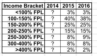 Update: Thanks to Andrew Sprung reminding me of the answer to one question I'd forgotten about: Since financial assistance only applies to those between 100-400% FPL, who the heck are the 3% below 100% who are enrolling via the exchanges? That's around 380,000 people this year. I assumed that these were mostly people caught in the "Medicaid Gap", but really, those folks wouldn't be able to pay full price for even the cheapest Bronze policy (perhaps Catastrophic in some cases). Andrew reminded me that legally-present non-citizens (who are barred from enrolling in Medicaid for 5 years) are eligible for ACA tax credits if their income is under 100% FPL.