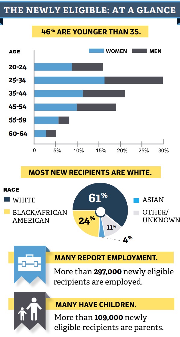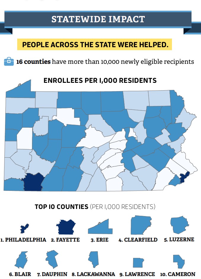 As of April 2016, the expansion had reached 625,970 newly eligible Pennsylvanians, ages 18 to 64.