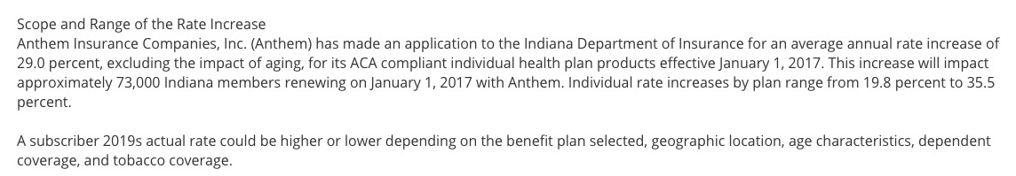 The good news is that I was able to track down the average rate change for all 6 carriers offering individual plans in Indiana (UnitedHealthcare is dropping out of the market, and I'm not sure what's going on with Aetna and Coordinated Care Corporation, both of which do have listings in Indiana's SERFF database for 2017...but neither of which has any actual filings listed. I presume these are placeholders for them to potentially enter the state market, which would be a good thing (and which Aetna has already indicated they might be doing next year). In addition, Golden Rule says that they'll be offering ACA-compliant policies starting next year as well (mainly for their current "transitional" enrollees).