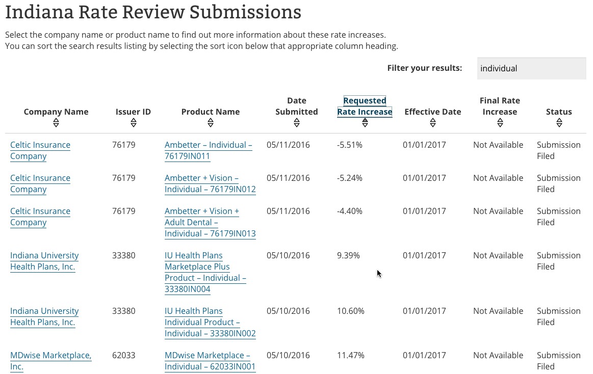 Well, as it happens, shortly after that, they stated that they would, indeed, start doing just that for 2017. There was some confusion about whether I was misreading the new policy or not, but I'm happy to report that sure enough, if you plug Indiana into the Rate Review site (and pick 01/01/17 as the starting and ending dates), you'll see the following (I've sorted them by requested rate increase, lowest to highest):