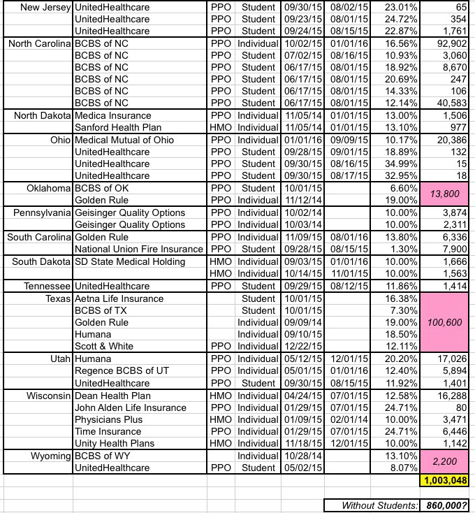 The bigger issue is that, as I noted earlier, many of the filings are from 2015 or even from late 2014, which means that the data is out of date. Again, Golden Rule's Michigan filing is from 6/26/14, nearly 2 years ago, for policy rates which were set to go into effect on 1/1/15. How many of those 37,530 people have turned 65 (switched to Medicare), gotten a job with benefits (switched to ESI), fallen on hard times (switched to Medicaid), moved to a different state (switched to an ACA-compliant policy) or...well, died? I don't know, but the point is made.