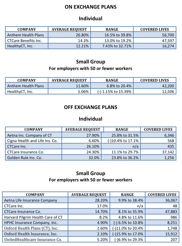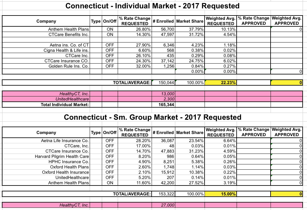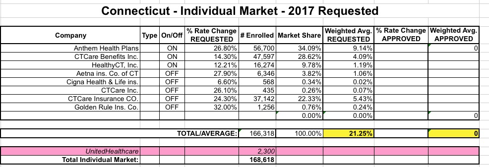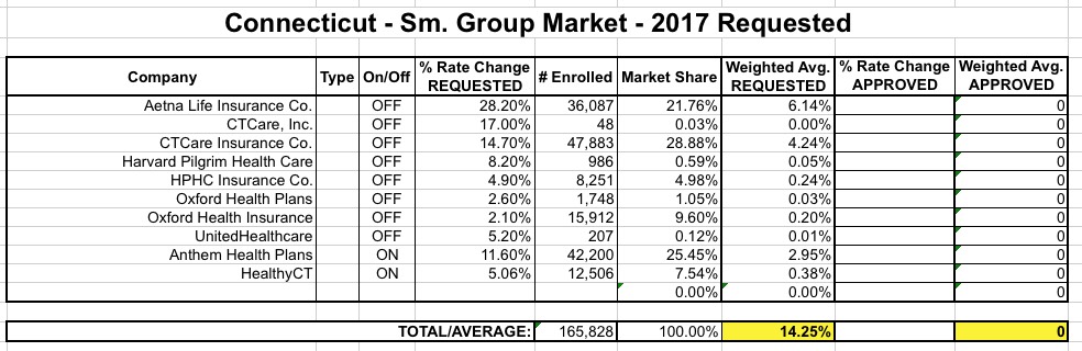 Thanks to commenter "Junaed S" who directed me towards this simple, cut 'n dry PDF from the Connecticut Dept. of Insurance detailing the requested rate hikes for the CT individual and small group markets for 2017: