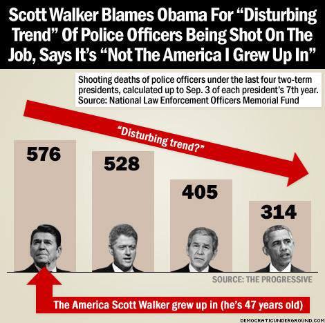 In other words, Scott Walker, while you're absolutely correct that this "isn't the America you grew up in", that isn't because police officers are more likely to die of a gunshot wound.