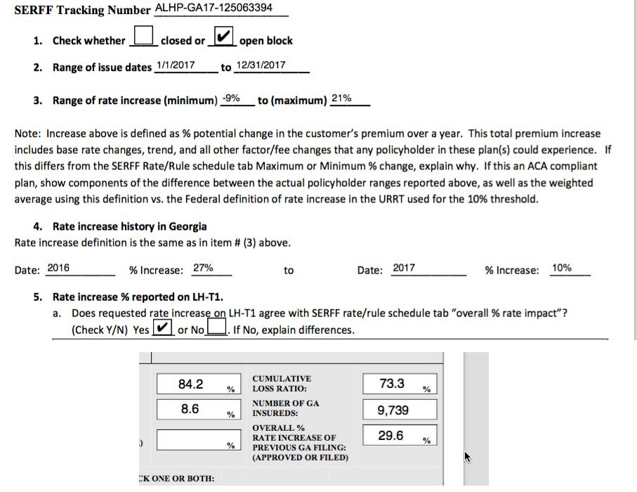 Thanks to Don Kramer for finding an article in Georgia Health News from back in May, in which healthcare reporter Andy Miller posts some of the 2017 requested GA rate hikes from some of the carriers in the state...but it remains frustratingly incomplete, and he doesn't provide any links to the actual filings themselves. I can't find anything listed on the Georgia Insurance Dept. website, GA doesn't appear to use the SERFF database, and GA isn't posted at the HC.gov Rate Review database yet either, so I'm stumped as to how Miller got ahold of these numbers. I've asked him about this, and will update this entry if/when he responds (or if/when any of the above sources posts Georgia's data anyway).