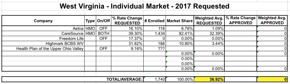 OK, this is irritating. Officially, all of West Virginia's 2017 rate filings have been submitted already, for 4 carriers (plus a fifth, "Freedom Life", which is more of a placeholder than anything). However, the official enrollment numbers for all of them only total around 1,700 people...compared to WV's total individual market size of at least 42,000 (in fact, 33.2K were enrolled in exchange-based policies as of the end of March).