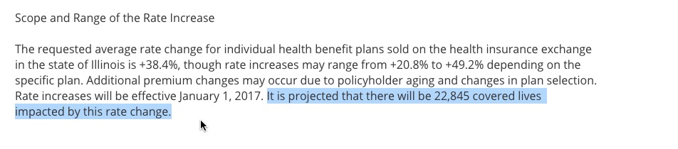 UPDATE: Ouch. As a couple of people called to my attention, while the individual listings for BCBSIL range from 23% to 45%, their actual average requested rate hike is higher yet: 50.2%. As ACA opponent Jonathan Ingram explained, the lower rates appear to include policies which are being cancelled, while the 50.2% figure includes those who are expected to be mapped to plans which will still be available. I've updated the table above to reflect this correction.