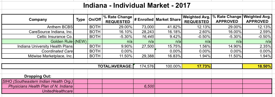 Believe it or not, Indiana's individual market situation is actually among the brighter spots this year. While three carriers are dropping off of of the ACA exchange market (and Physicians Health Plan is dropping off-exchange policies as well), they're also seeing the addition of a new carrier (Golden Rule), and one major carrier, Celtic, actually requested and received an average reduction in their monthly premiums, which is pretty rare this go around.