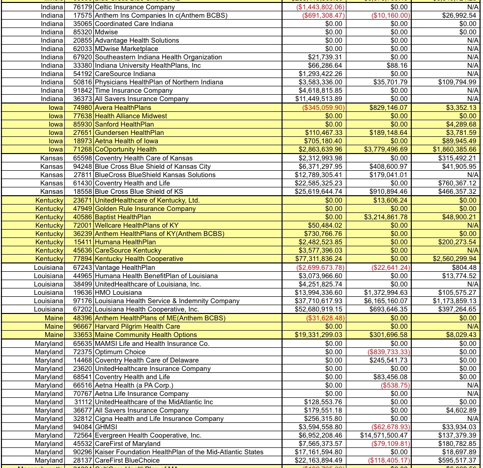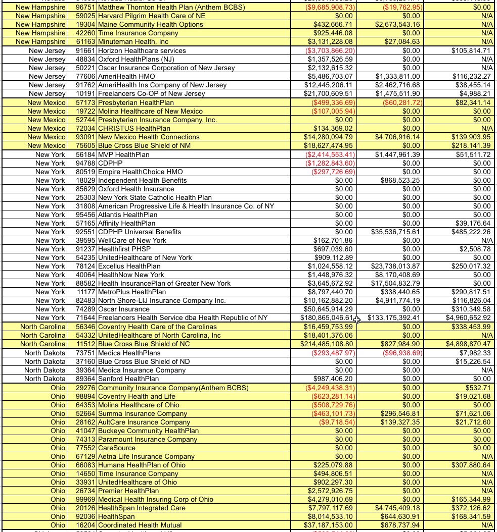 A table follows, listing every carrier across the country which owes money to or is owed money from the Risk Corridor program for 2015, as well as how much 2015 funding will be paid out to them to cover what's still owed for 2014. It's a long list, and some of the numbers are pretty big.