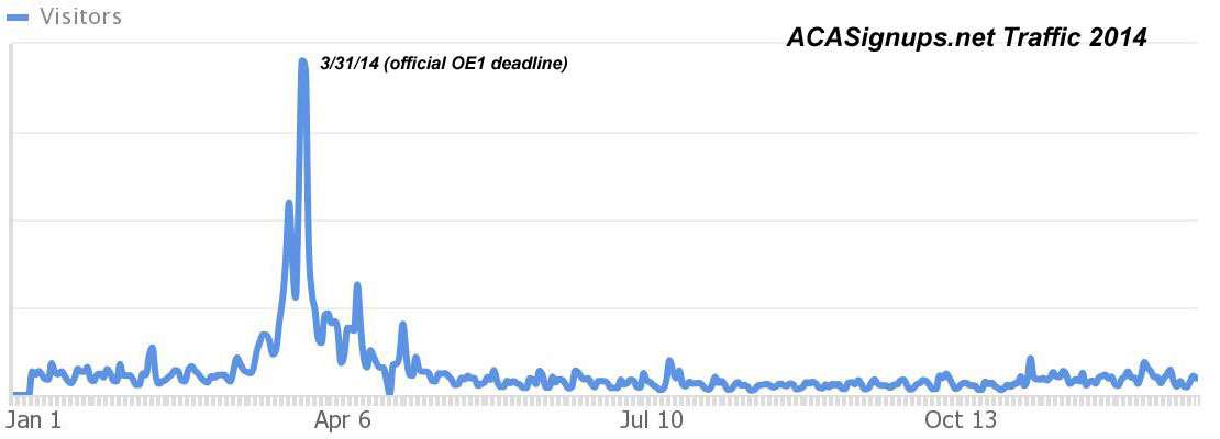 As an aside, here are similar charts for 2014 and 2015. As you can see, there were fewer significant spikes in the prior years, although nothing can compare to the big one on March 31, 2014 (the official deadline of the very first Open Enrollment Period, although they also tacked on a 2-week "overtime" period to handle the overflow traffic). I've yet to surpass that record and likely never will (the day of the Supreme Court's King v. Burwell ruling came close).