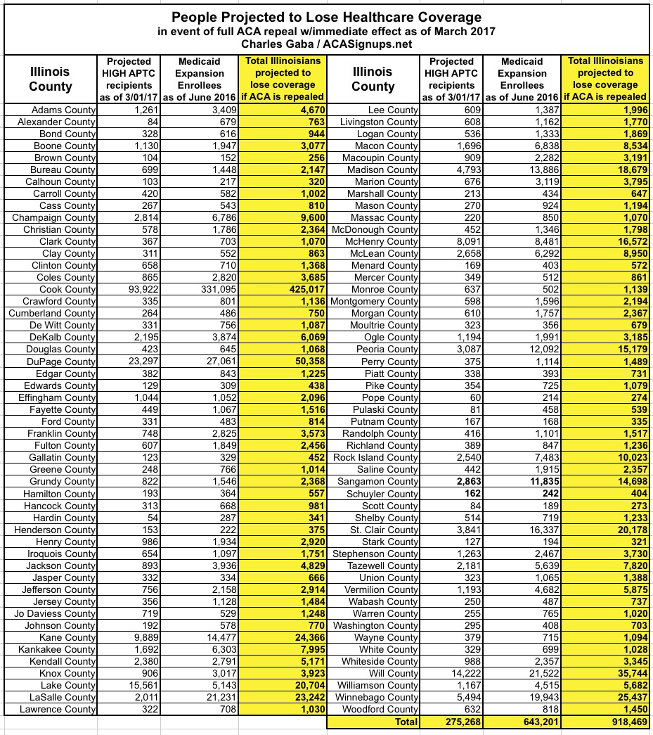 Illinois is pretty straightforward. Assuming 400,000 people enroll in exchange policies by the end of January (a modest 3% increase over last year), I estimate around 275,000 of them would be forced off of their private policy upon an immediate-effect full ACA repeal, plus the 643,000 enrolled in Medicaid expansion as of June 2016, for a total of just over 918,000 Illinoisians kicked to the curb.