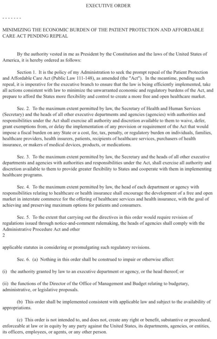 With this executive order, there should be no doubt that the Trump Administration is moving to unwind the ACA, but it won't be immediate.
