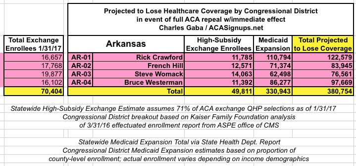 In Arkansas, 70,404 people enroll in private exchange policies as of the end of January. I estimate around 50,000 of them would be forced off of their private policy upon an immediate-effect full ACA repeal, plus another 331,000 enrolled in Arkansas' "Private Option" ACA Medicaid expansion program for a total of 380,000 residents kicked to the curb.