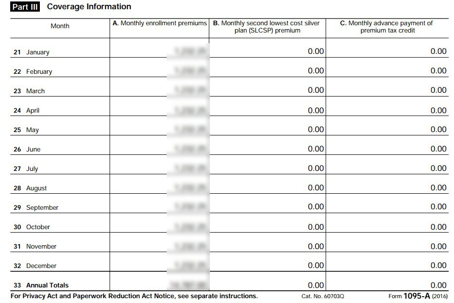 Column A is the full, unsubsidized premium. Column B is supposed to be the Benchmark Silver Plan Premium available to us, which (I later found out) was around $632/month. And column C is the APTC we were supposedly eligible for...which should be $34/month. Instead, both columns read $0.00. Yes, that's right: They never did actually resolve the June 2016 issue, so still had us down as not being eligible for any credits.