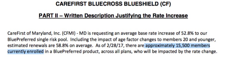Assuming all of the numbers below are accurate and that I'm not missing any major data points, it looks to me as though Maryland insurance carriers are initially requesting an unsubsidized, full-price, weighted average rate hike of roughly 44.6% on the individual market.