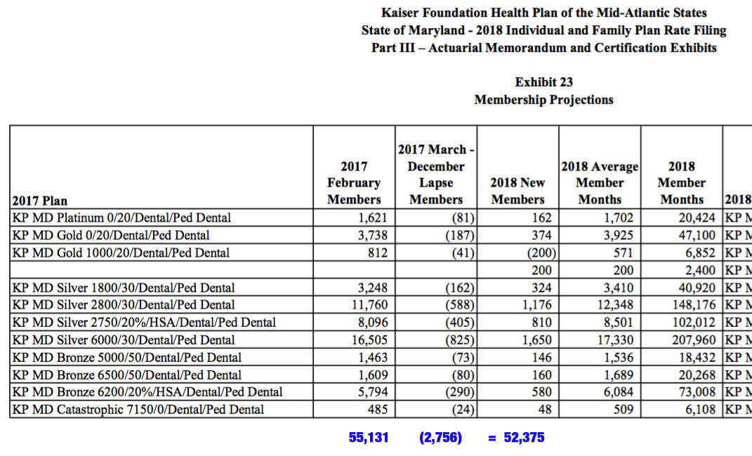 Kaiser didn't actually list the number of projected enrollees, so I had to dig into their "Exhibits" file and figure it out there. They apparently had 55,131 people enrolled in their ACA-compliant policies in February, and expect to lose around 2,700 of them by the end of the year, meaning they expect to start 2018 out with around 52,375 enrollees.
