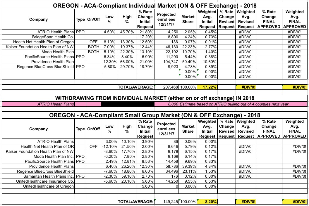 Oregon is the 5th state to post their initial 2018 rate filings. Last year their weighted average increase was roughly 26.5% across 10 individual market carriers. This year I only see 8 carriers offering policies on the indy market, but the two missing are "Trillium" and "ZOOM", neither of which had more than a handful of enrollees to begin with.