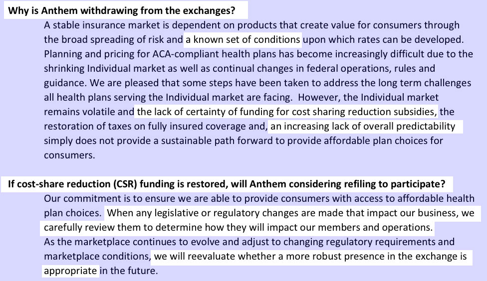 - In Ohio, Anthem announced that they're dropping out of the individual market (both on and off-exchange, although they'll technically still offer a single catastrophic policy in a single county (Pike), off-exchange only, in order to allow them to re-enter the market in 2019. This is a Big Deal, since not only will 10,500 existing enrollees have to shop around, it could also leave 20 counties "bare" next year if no one else jumps in, and because Anthem is one of the Big Kahunas in the individual market; they could potentially leave other states as well, which would be an even bigger problem. It's important to note that, once again, Anthem is placing a huge chunk of the blame for this development squarely on Donald Trump and Congressional Republicans, stating in their FAQ: