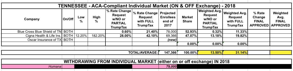 To my knowledge, there are actually 6 individual market carriers in Tennessee this year: Aetna, TRH (Tennessee Rural Health), Blue Cross Blue Shield, Cigna, Humana and "Freedom Life" (which, again, is basically a phantom carrier with no enrollees). Aetna and Humana are out, so that leaves TRH, BCBSTN and Cigna. TRH doesn't appear to have submitted an official 2018 rate filing as of yet, but they only had 3,500 enrollees this time last year anyway, so likely won't have much impact on the overall weighted average rate hikes.