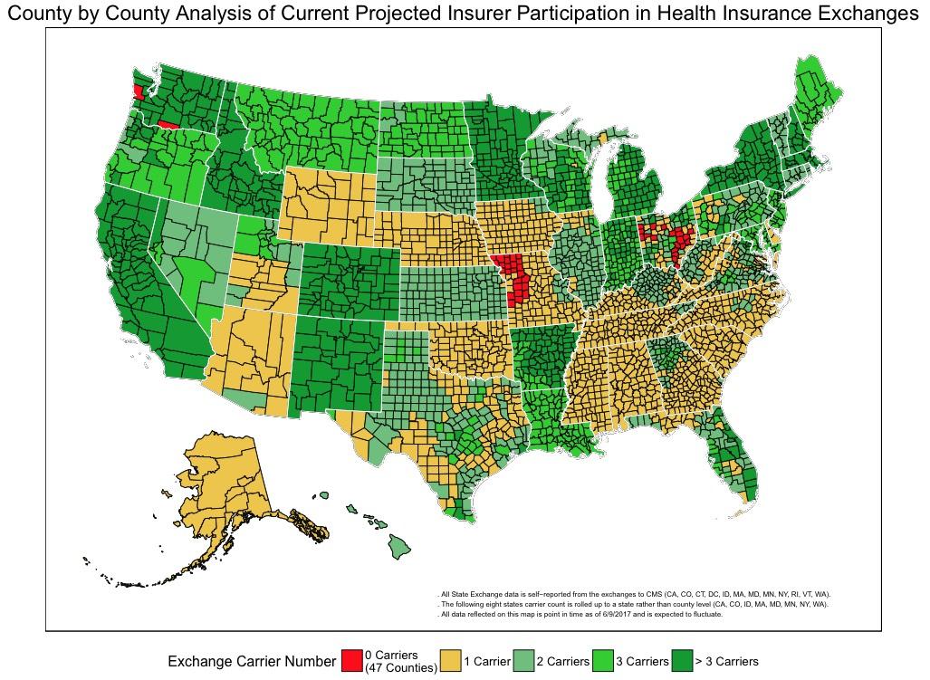 The Centers for Medicare & Medicaid Services (CMS) is releasing a county-level map of 2018 projected Health Insurance Exchanges participation based on the known issuer participation public announcements through June 9, 2017. This map shows that insurance options on the Exchanges continue to disappear. Plan options are down from last year and, in some areas, Americans will have no coverage options on the Exchanges, based on the current data.