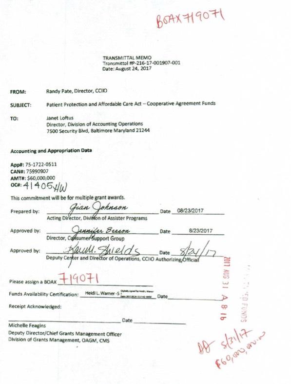 There's also an additional document semi-related to this issue: A fund transfer authorization memo cutting $21,000,000 from the Enrollment Assister program and applying it to the Special Enrollment Period Verification Program.